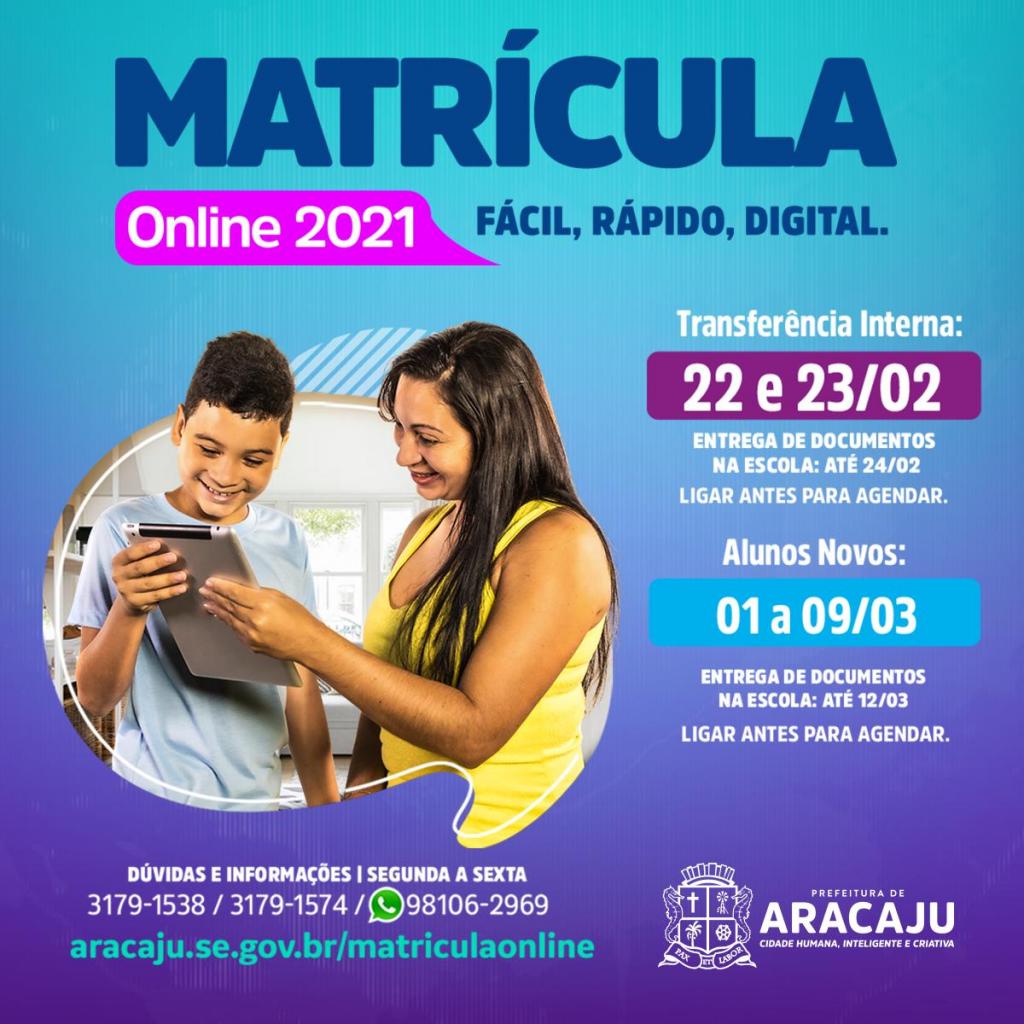 A Prefeitura de Aracaju deu início nesta segunda-feira, 22, à primeira fase da Matrícula Online 2021. Até a terça-feira, dia 23, o Portal estará disponível para a solicitação de transferência interna, destinada aos alunos já matriculados na rede municipal que desejam se transferir para outra unidade da rede. Somente nas primeiras duas horas de abertura do Portal, o sistema registrou cerca de 500 solicitações realizadas.