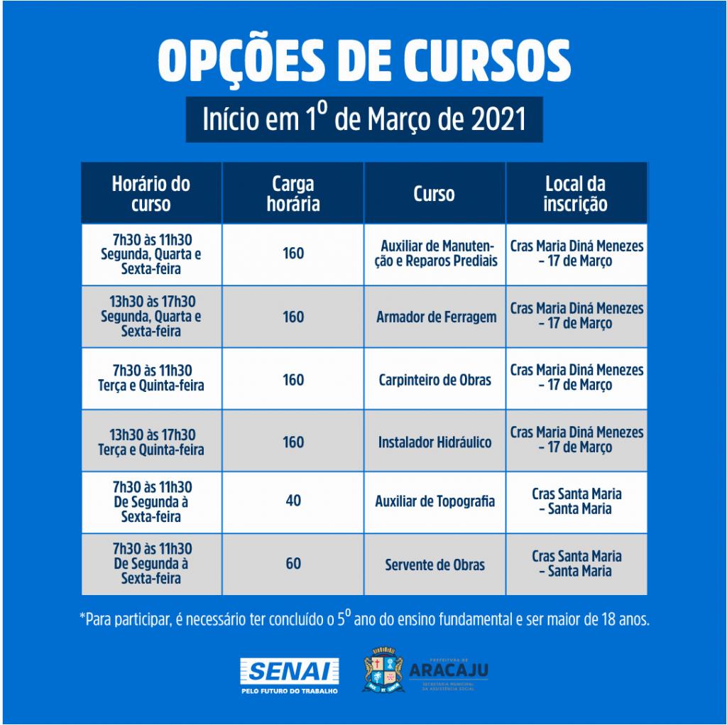A Prefeitura de Aracaju, por meio da Secretaria Municipal da Assistência Social, prorrogou até a próxima sexta-feira, dia 26, o período de inscrições para os cursos profissionalizantes, na área da Construção Civil, ofertados em parceria com o Serviço Nacional de Aprendizagem Industrial (Senai). No total foram disponibilizadas 120 vagas para seis opções de cursos.