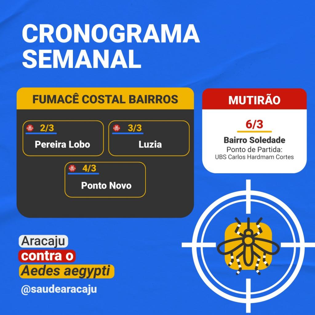 Paralelo ao trabalho de coleta do LIRAa, os agentes também executarão o cronograma semanal de ações de combate ao Aedes, com a aplicação do fumacê costal e mutirão. Para esta semana, na terça-feira, 2, os agentes estarão no bairro Pereira Lobo; na quarta-feira, 3, no Luzia; e na quinta-feira, 4, no Ponto Novo. O mutirão acontecerá no sábado, 6, no bairro Soledade, tendo como ponto de encontro a UBS Carlos Hardman Cortês.