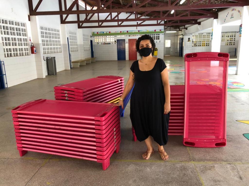A Escola Municipal de Educação Infantil (Emei) Nunes Mendonça, localizada no bairro Atalaia, recebeu 40 camas empilháveis. A coordenadora pedagógica da unidade, Flávia Hermínia Costa, reforça que o novo mobiliário recebido ajudará a atender melhor os alunos que fazem parte da creche.