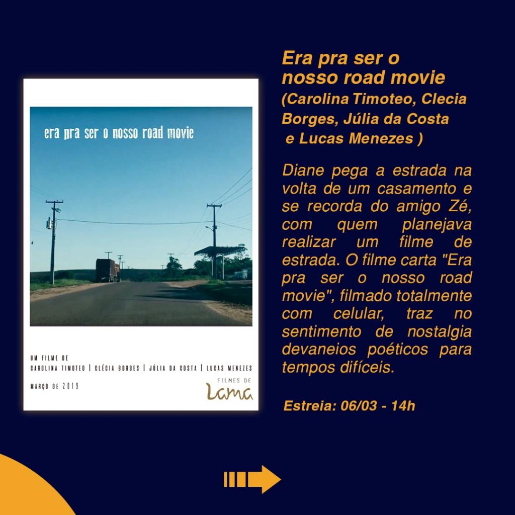 Para abrilhantar o sábado da população aracajuana, “Era pra ser o nosso road movie”, obra dirigida por Carolina Timoteo, Clecia Borges, Júlia da Costa e Lucas Menezes, filmada com celular, traz o sentimento de nostalgia e devaneios poéticos para tempos difíceis.