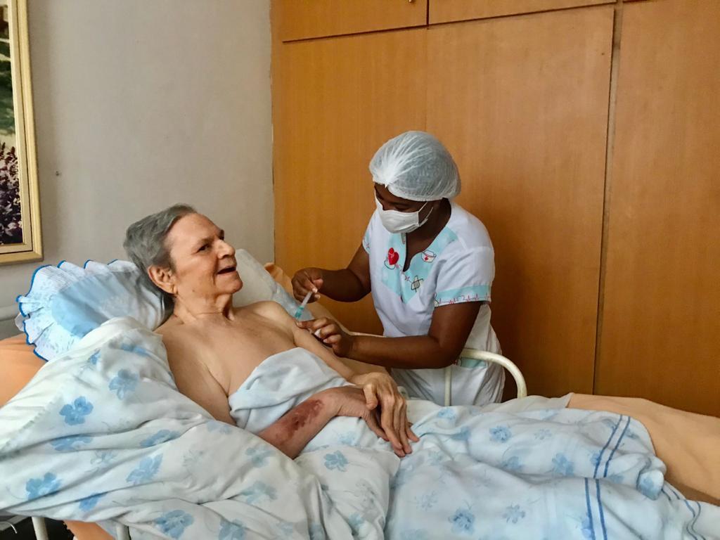 O mesmo pensamento de satisfação com a aplicação da vacina é compartilhado também pela cuidadora Tatiana Braz Menezes, que cuida da senhora Rita Ribeiro Nunes, de 84 anos. “É um alívio para a família e para todos nós vê-la tomar a segunda dose da vacina. Estou me sentindo muito aliviada. Dona Rita tem uma série de comorbidades que a colocam em risco de vida, e esta segunda dose de imunização é a esperança de dias melhores”, falou.