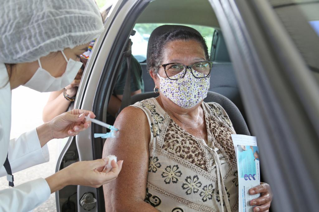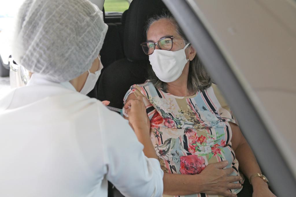 Quem esteve no drive-thru da Sementeira para receber a primeira dose foi a dona de casa Rosemeire Barbosa Farias Cardoso, de 60 anos. Externando felicidade, ela almeja que toda a população brasileira seja logo imunizada.