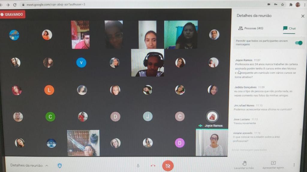 A Fundação Municipal de Formação para o Trabalho ( Fundat) realizou, nesta quinta-feira 22, a oficina online de capacitação Processo Seletivo Virtual e Currículo Online, em parceria com a Universidade Federal de Sergipe (UFS). A formação contou com a participação de 40 alunos, e foi ministrada das 10h às 12h, pela instrutora Edênia Dumont, na plataforma Google Meet.