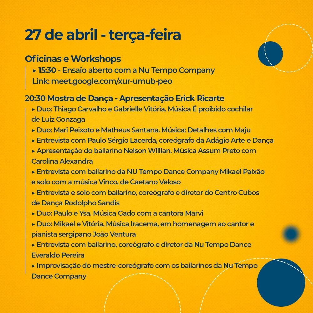 A programação cultural foi intitulada "Sergipe em Dança" e construída em parceria com a NU Tempo Dance Company, contemplada no edital Janelas para as Artes, através dos recursos destinados pela Lei Aldir Blanc.