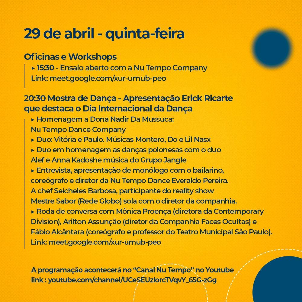 ➢ Ensaio aberto com a Nu Tempo Company 15:30 horas Link da videochamada: https://meet.google.com/xur-umub-peo