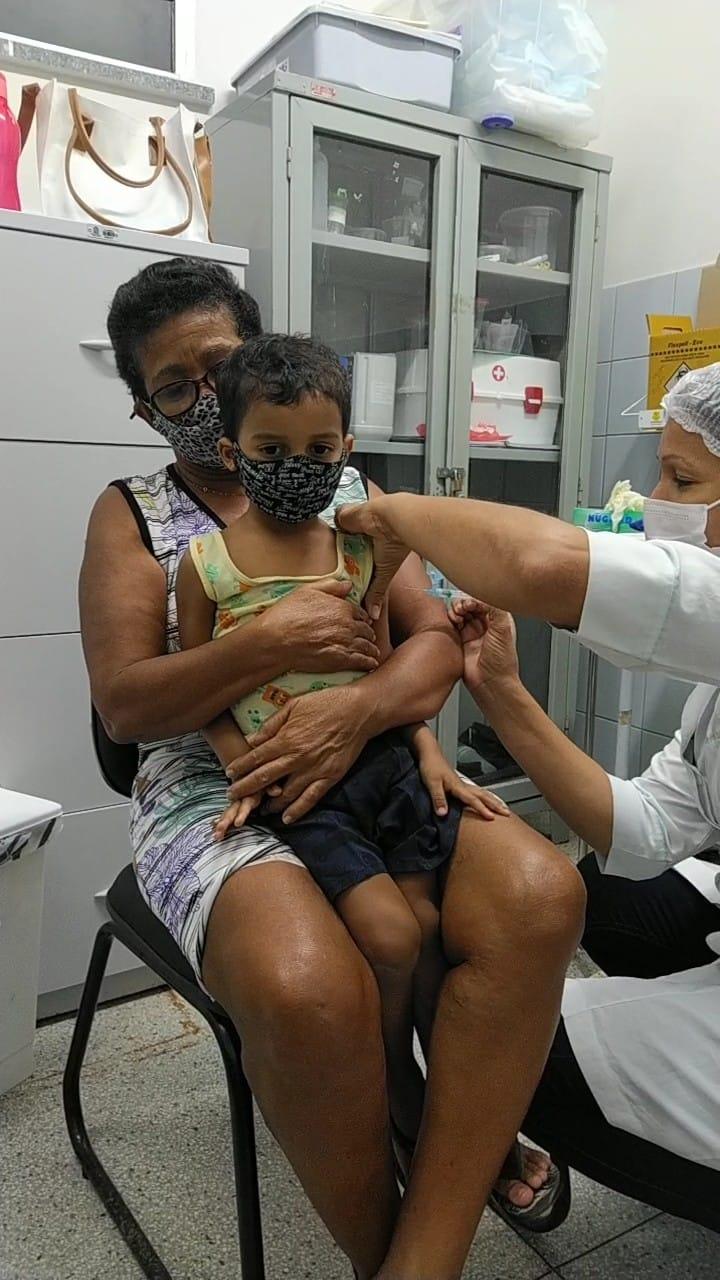 A senhora Maria de Fátima Oliveira levou o netinho Miguel Santana de Oliveira, de três anos, para se vacinar na UBS Francisco Fonseca. “A mãe dele se preocupa muito em manter o cartão de vacinação atualizado, vem sempre com ele para se vacinar. É importante para a saúde e o desenvolvimento dele, sem dúvida”, reconhece.