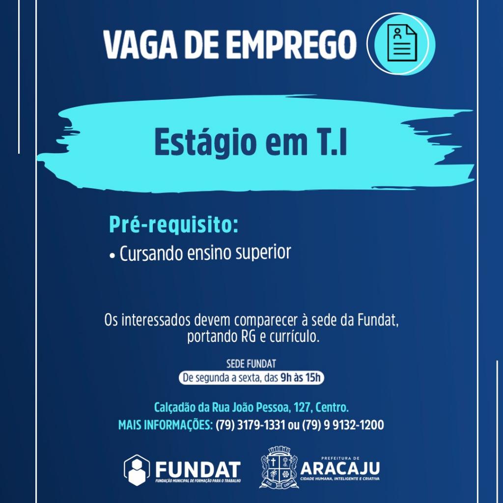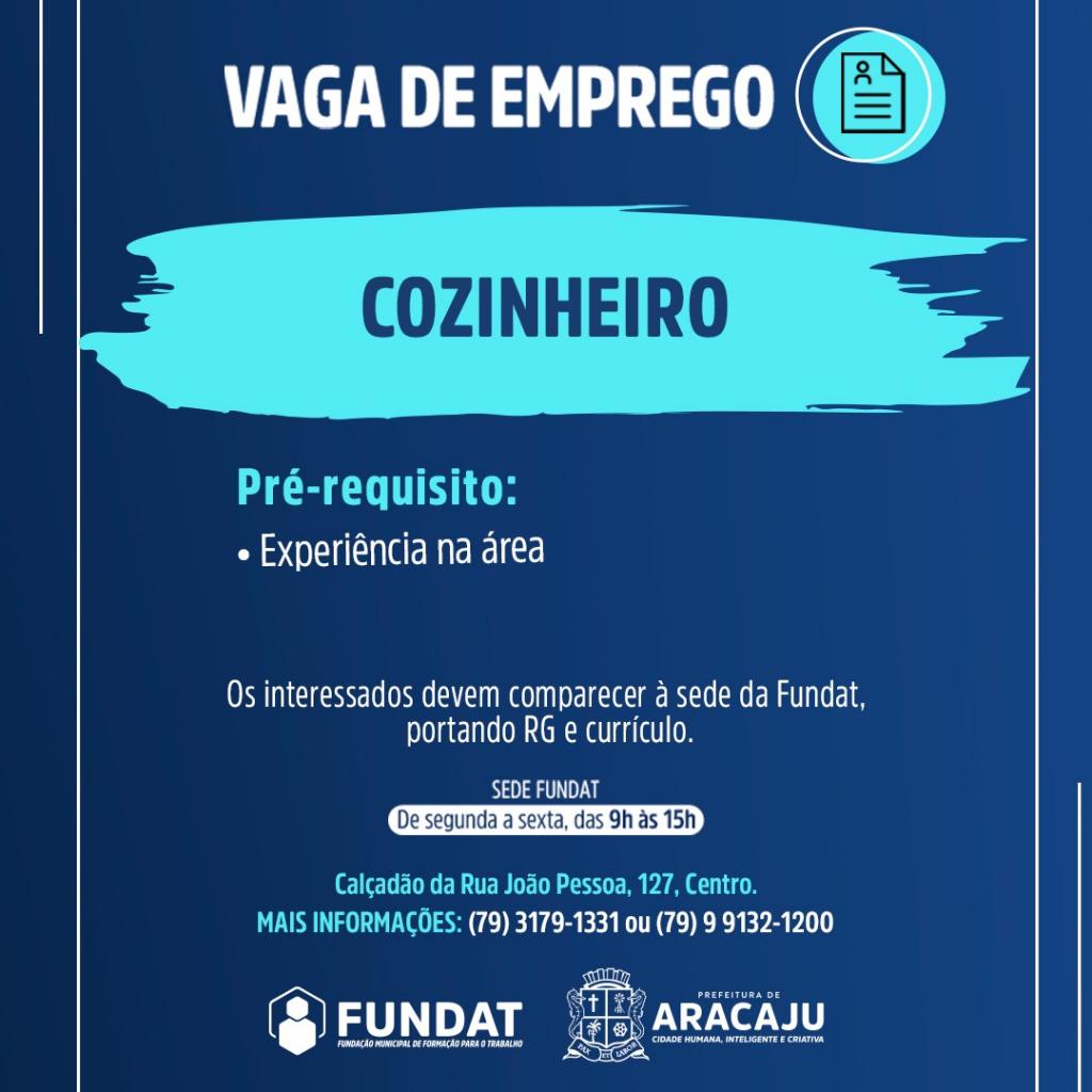 Nesta quinta-feira, 13, o serviço de encaminhamento ao mercado de trabalho, ofertado pela Prefeitura de Aracaju, por intermédio da Fundação Municipal de Formação para o Trabalho (Fundat), está anunciando novas vagas para emprego. Desta vez, são para a função de cozinheiro e estágio em Tecnologia da Informação (T.I).
