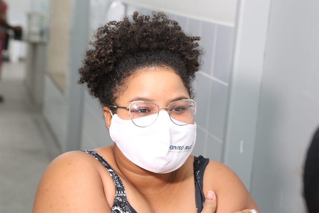 Katia Tavares, por sua vez, comemorou muito a primeira dose recebida neste sábado, no CCPA, uma vez que a covid-19 chegou a ameaçá-la de perto.
