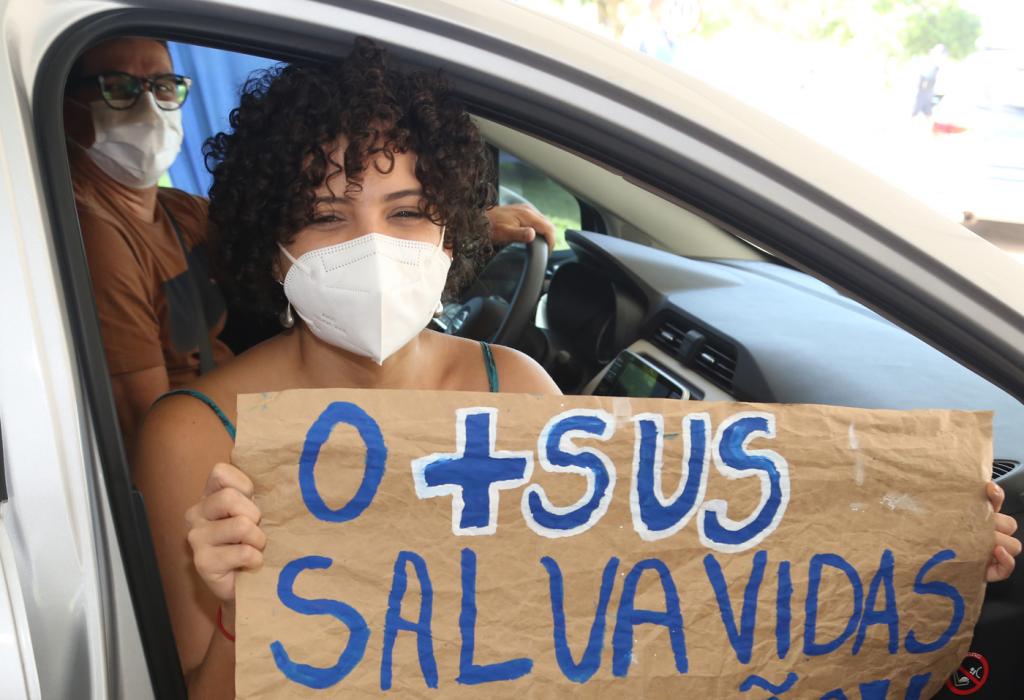 A nutricionista Silvia Eugênia Oliveira Valença, 27, também foi ao drive. Ela fez questão de levar consigo uma placa com mensagem de apoio ao Sistema Único de Saúde (SUS). "É uma vitória. Eu trabalho e pesquiso para o SUS e é muito gratificante ver que funciona. Estou muito feliz", destaca.