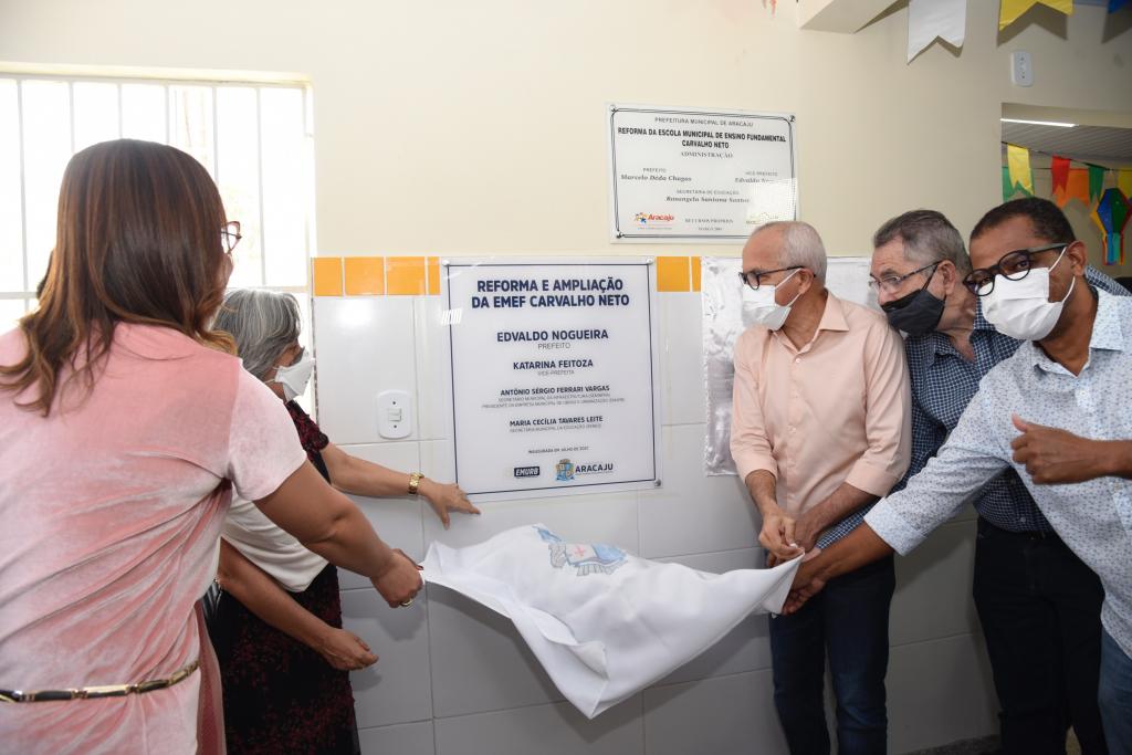 "Investir na educação é investir na transformação de vida das pessoas e na construção de uma sociedade melhor. Não existe outro caminho senão a educação". A afirmação foi feita pelo prefeito Edvaldo Nogueira, na manhã desta terça-feira, 6, ao inaugurar a Escola Municipal de Ensino Fundamental (Emef) Carvalho Neto. Localizada no bairro Novo Paraíso, a unidade de ensino foi completamente reestruturada, tendo sua área duplicada para o atendimento de até 800 estudantes dos ensinos Fundamental e para Jovens e Adultos (EJA). Retomada na gestão anterior de Edvaldo, em 2017, a obra de reforma e ampliação da Emef é mais um compromisso do gestor com a população que se cumpre. Foram investidos mais de R$ 2 milhões na execução do projeto, com recursos próprios da Prefeitura.