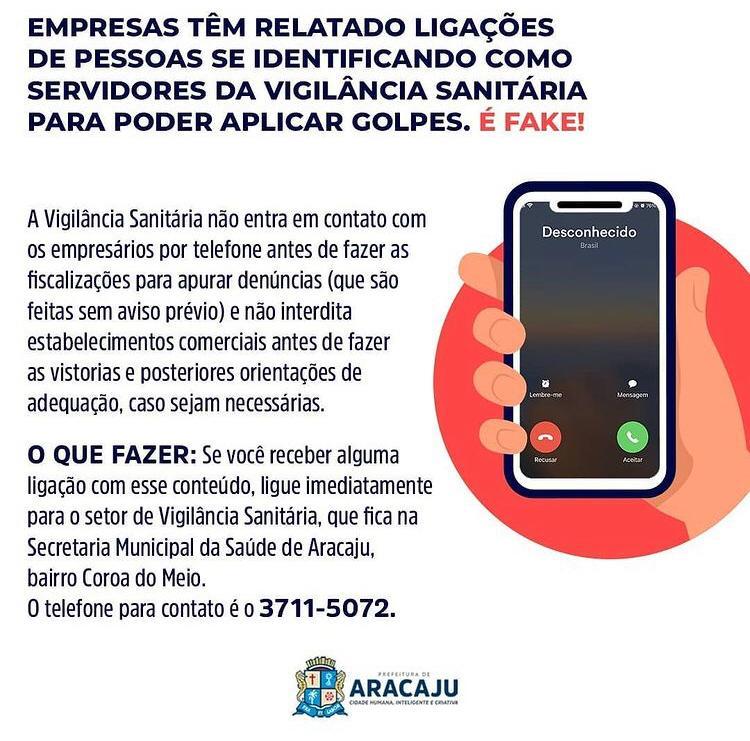 A Secretaria Municipal da Saúde (SMS) desmente a informação que está circulando sobre o golpe de um suposto funcionário da Vigilância Sanitária de Aracaju que estaria entrando em contato com empresários, por telefone, afirmando ser fiscal do órgão com a finalidade de aplicar golpes a partir de ameaças.