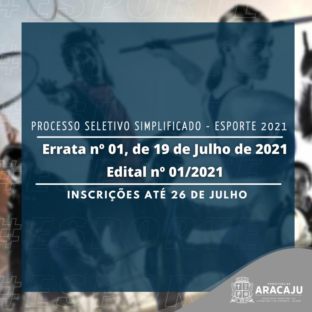 A Prefeitura de Aracaju, por meio da Secretaria Municipal do Planejamento, Orçamento e Gestão (Seplog), publicou errata nesta segunda-feira, 19, referente ao Edital nº 01/2021, que trata do Processo Seletivo Simplificado (PSS) da Secretaria Municipal da Juventude e do Esporte (Sejesp).