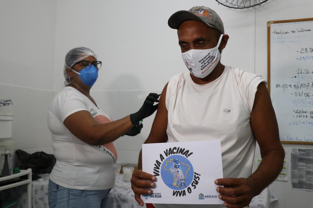 Para garantir a saúde dos cidadãos que enfrentam a vivência da situação de rua, a Prefeitura de Aracaju, por meio das Secretarias Municipais da Assistência Social e da Saúde (SMS), cumpriu o primeiro ciclo de vacinação desse público contra a covid-19.