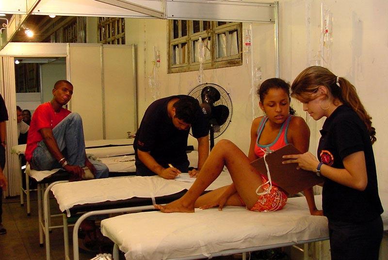 Na primeira noite de folia, a Secretaria Municipal de Saúde (SMS) marcou presença entre os foliões do Pré-Caju 2005. Através do Serviço de Atendimento Móvel de Urgência (Samu 192 Aracaju), da Coordenação de Vigilância Sanitária (Covisa) e da Coordenação DST/Aids, a SMS ofereceu ao evento uma estrutura capaz de garantir a segurança médica do público. No posto médico, montado nas dependências do Vasco Esporte Clube, o Samu registrou 76 atendimentos, sendo 35 dos casos clínicos e 41 traumáticos. Alcoolismo e ferimentos foram as causas mais freqüentes. Apenas um caso grave foi registrado. Um rapaz que chegou ao posto com trauma craniano. Segundo informações, ele teria sido espancado. A equipe estabilizou o paciente e o encaminhou ao Hospital Governador João Alves Filho (HGJAF). Ao todo foram 15 remoções. Sete delas para a Unidade de Urgência do Hospital São José, seis para o Hospital Cirurgia e três para o HGJAF. Do total de pacientes atendidos, nove eram adolescentes que tinham entre 14 e 17 anos de idade e estavam alcoolizados. Após o atendimento eles foram encaminhados ao posto do Juizado da Infância e da Juventude, montado na área do evento. Segundo o coordenador médico do Samu, Clóvis França, o número de casos atendidos surpreendeu a equipe. Para o primeiro dia de folia, 76 atendimentos foi mais do que o esperado, mas ocorreu tudo bem, os 25 profissionais conseguiram dar conta, completa. Já o trabalho da Vigilância Sanitária foi mais calmo. Apesar da chuva, os 10 técnicos atuaram no local do evento, fiscalizando bares, carros de lanche, barracas de capeta e banheiros químicos. Nessas inspeções apenas oito bisnagas de mostarda e maionese foram apreendidas. Para o gerente de alimentos da Covisa, Geraldo Santana, as poucas apreensões se devem ao trabalho de capacitação da SMS. Antes do Pré-caju nós demos todas as orientações aos comerciantes, afirma. Na barraca de DST/Aids cerca de 2.500 preservativos foram distribuídos. Segundo a coordenação, a chuva acabou dificultando o acesso dos foliões ao local de distribuição.
