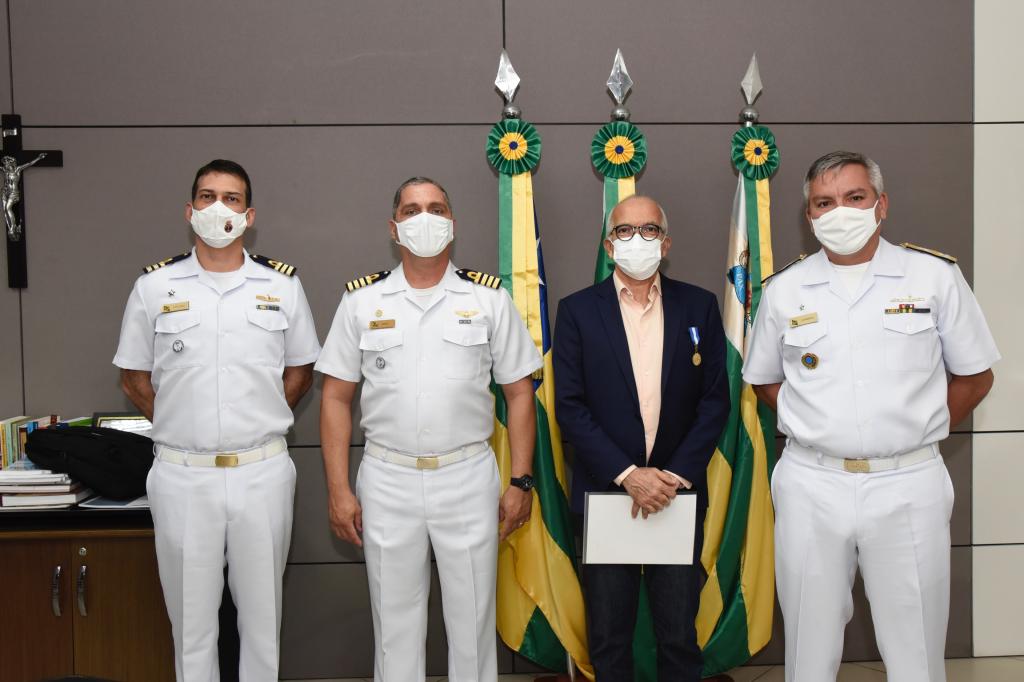 O prefeito Edvaldo Nogueira foi homenageado, na tarde desta quinta-feira, 29, pela Capitania dos Portos de Sergipe. O gestor recebeu do vice-almirante do 2º Distrito Naval Bahia-Sergipe, Humberto Caldas Silveira Junior, o diploma e medalha Amigo da Marinha, em reconhecimento aos serviços prestados à Marinha do Brasil. Também participaram da homenagem, ocorrida no gabinete de Edvaldo, o capitão de Mar e Guerra Guilherme Conti Padão, o novo comandante da Capitania de Portos de Sergipe, que será empossado nesta sexta-feira, 30, o capitão de Fragata Luciano Maciel Rodrigues, e o suboficial-mor da CP-SE, Jacson Marcondes Batista Santos.