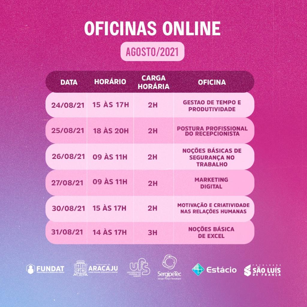 Por intermédio da Fundação Municipal de Formação para o Trabalho (Fundat), a Prefeitura de Aracaju abriu, nesta terça-feira, 3, as inscrições para 16 oficinas online que abrangem diversas áreas de conhecimento. As capacitações são gratuitas e desenvolvidas em parceria com a Universidade Federal de Sergipe (UFS), Sergipe Tec, Universidade Estácio de Sá e Faculdade São Luís.