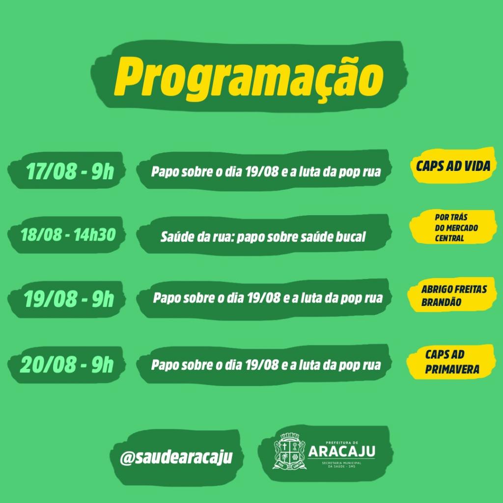 A data de 19 de agosto é marcada como o Dia Nacional da Luta da População em Situação de Rua, mas, ao longo de todo o ano, a Prefeitura de Aracaju, por meio da Secretaria Municipal da Saúde, desenvolve ações e estratégias de cuidado dessa população mais vulnerável. Além de utilizar os equipamentos de saúde, o trabalho também é realizado em parceria com a Secretaria Municipal de Assistência Social.