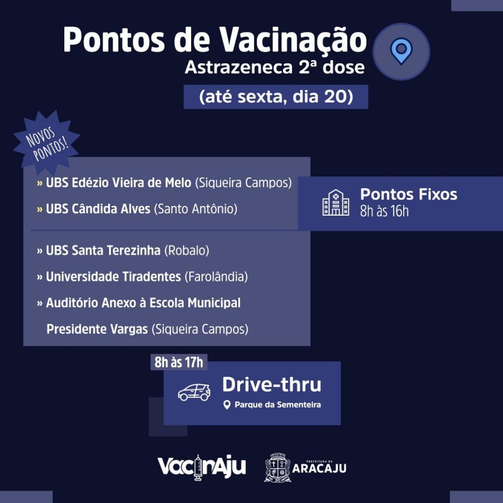 A partir desta quarta-feira, 18, quem quiser antecipar a segunda dose da AstraZeneca pode garantir a aplicação na Universidade Tiradentes (Farolândia), UBS Edézio Vieira de Melo (Siqueira Campos) e UBS Cândida Alves (Santo Antônio).