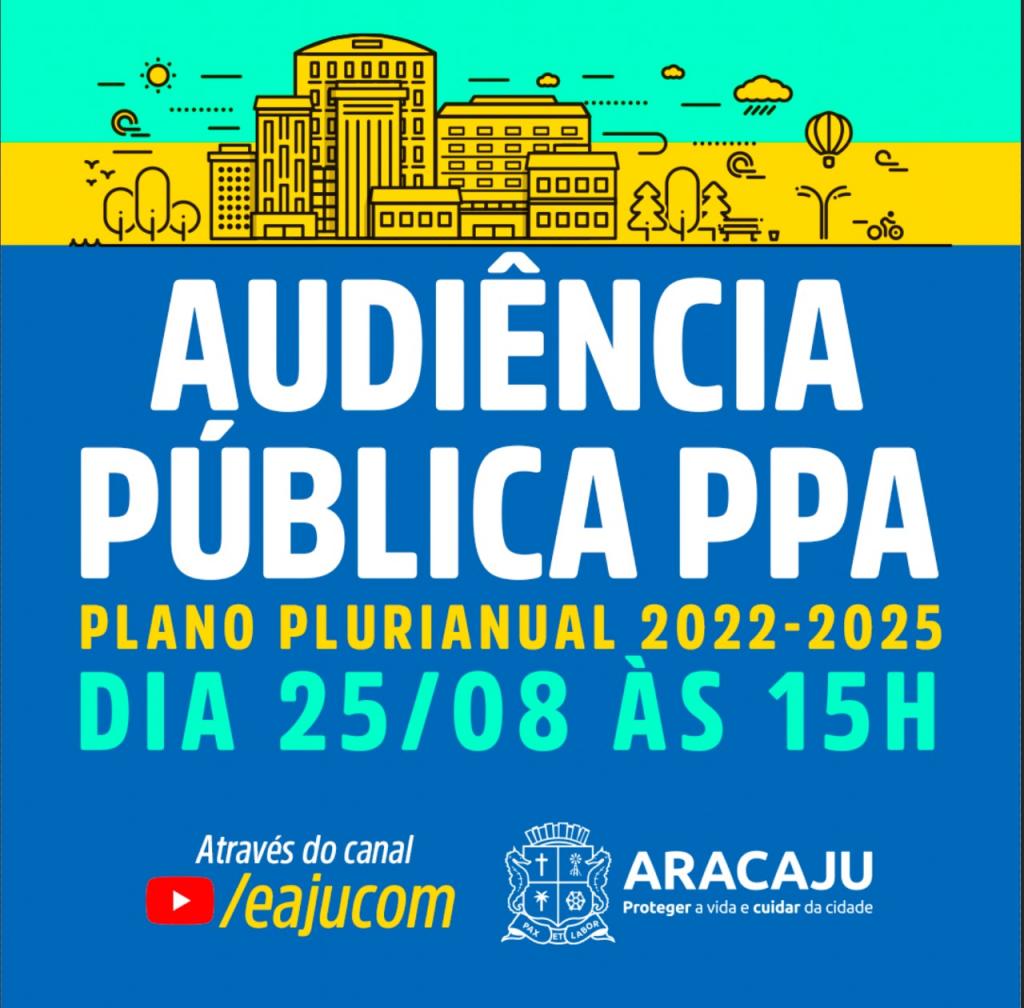 A Prefeitura de Aracaju, por meio da Secretaria Municipal do Planejamento, Orçamento e Gestão (Seplog), convida toda a população aracajuana para participar da audiência pública virtual com o objetivo de apresentar, discutir e elaborar o Plano Plurianual (PPA) para o período de 2022-2025. O encontro será realizado às 15h da próxima quarta-feira, dia 25, através do canal da PMA, na plataforma YouTube.