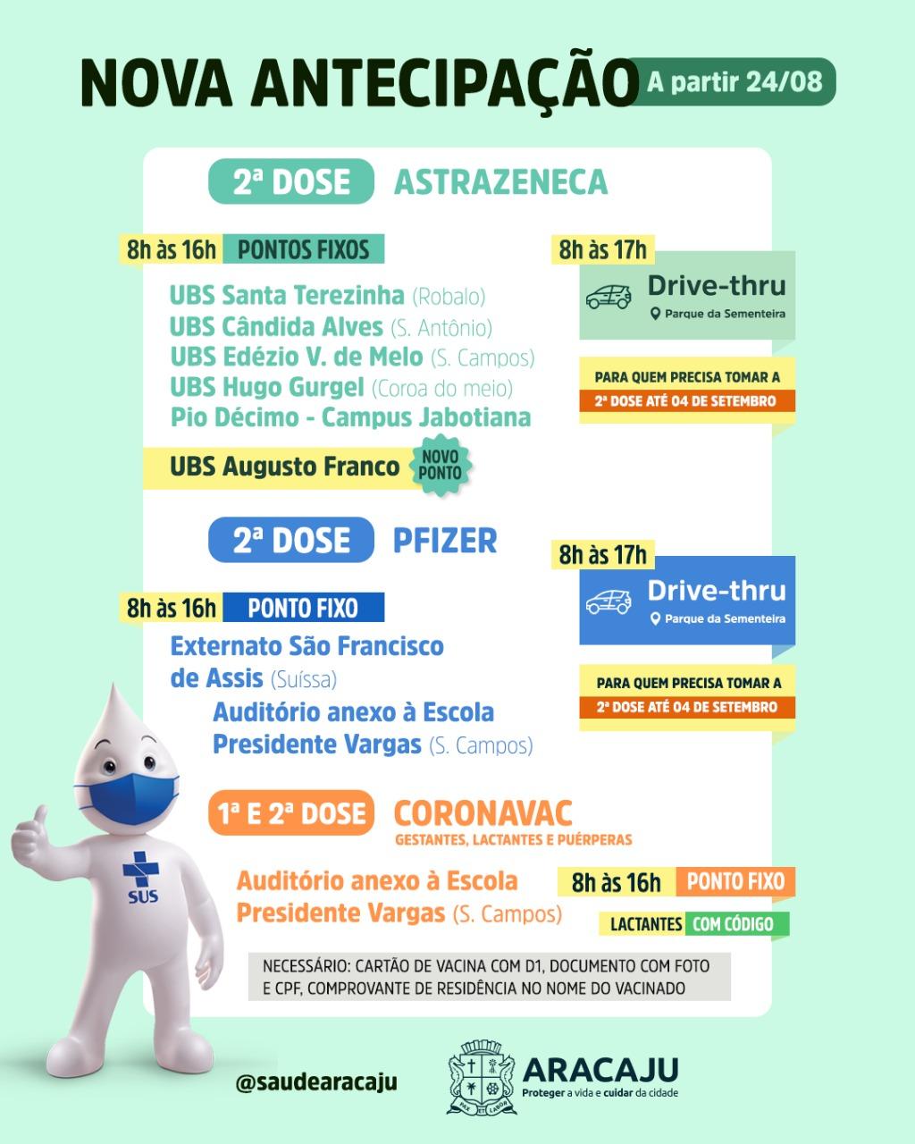 Para ser vacinado, basta levar o cartão de vacina comprovando que tomou a primeira dose, um documento com foto e CPF e um comprovante de residência de Aracaju no nome da pessoa que vai tomar a vacina.