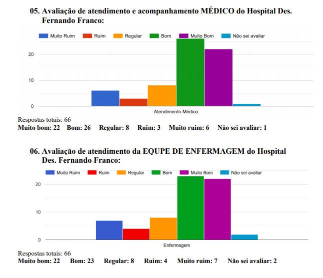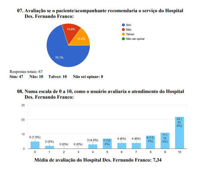 Questionados se recomendariam o serviço do Hospital Fernando Franco, dos 67 usuários, 47 responderam ‘sim’ à pesquisa. E numa escala de zero a dez, o hospital teve uma classificação média de 7,34.