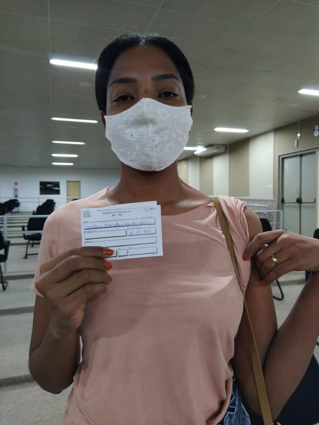 Nas primeiras horas do domingo, Hellen Caroline Reis, 28 anos, foi ao ponto no Auditório Antônio Vieira Neto para receber sua segunda dose.