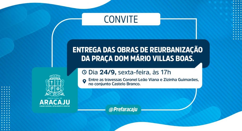A Prefeitura de Aracaju convida a imprensa para a entrega das obras de urbanização da praça Dom Mário Villas Boas, que ocorrerá nesta sexta-feira, dia 24, às 17h, entre as travessas Coronel Leão Viana e Zizinha Guimarães, no conjunto Castelo Branco.