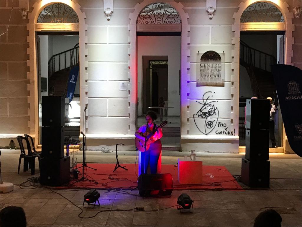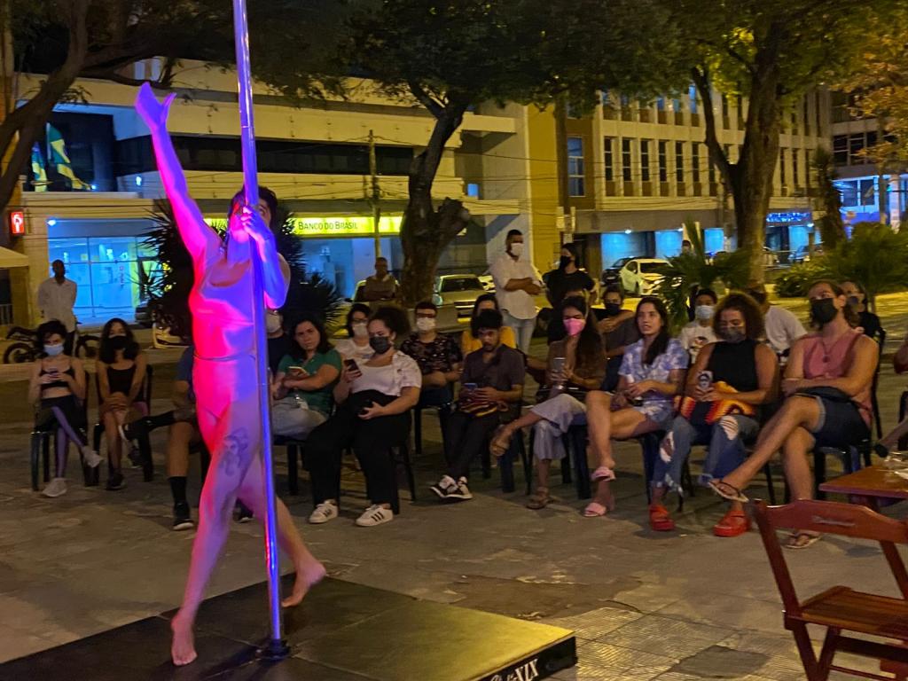 A segunda apresentação da noite ficou por conta de Tainá Teles que deu um show no pole dance e garantiu muitos aplausos da plateia. “Pra mim sempre foi difícil imaginar que o pole dance poderia estar no Centro de Aracaju e poder estar aqui hoje está sendo uma realização pessoal. Sou muito grata à Lei Aldir Blanc e à Prefeitura pela oportunidade. Estou muito feliz em estar aqui hoje”, disse Tainá.
