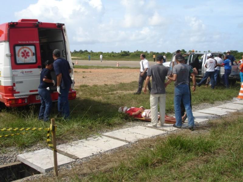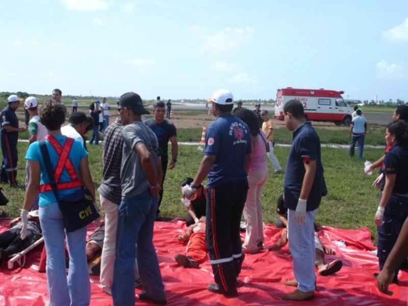 Durante a manhã de hoje, 17, a equipe do Serviço de Atendimento Móvel de Urgência (Samu 192 Aracaju) participou de um simulado de acidente aéreo promovido pelo curso do Corpo de Voluntários de Emergência (CVE), que acontece em todos os estados onde a Infraero administra os aeroportos. O curso oferecido pela Infraero teve início no dia 9, segunda-feira, e foi concluído hoje com um exercício que simulou a queda de uma aeronave no Aeroporto Santa Maria. O curso teve a participação de 130 alunos, 20 deles da equipe do Samu 192, que pelo quarto ano participa do evento dando suporte. “O objetivo principal do curso está na discussão levantada sobre urgências e emergências. Os alunos durante toda semana passaram por aulas teóricas e o simulado foi para por em prática o que os alunos aprenderam durante o curso”, explica o coordenador do Núcleo de Educação Permanente do Samu, Fábio Alves. Durante o simulado, além das equipes do Samu e da Infraero, estiveram presentes também equipes do Corpo de Bombeiros e da Polícia Militar. Cerca de 25 vítimas foram simuladas, e o resultado final, segundo o coordenador, foi bastante satisfatório. “O simulado é o que há de melhor nos treinamentos. Para nós do Samu o resultado foi bastante positivo”, concluiu.