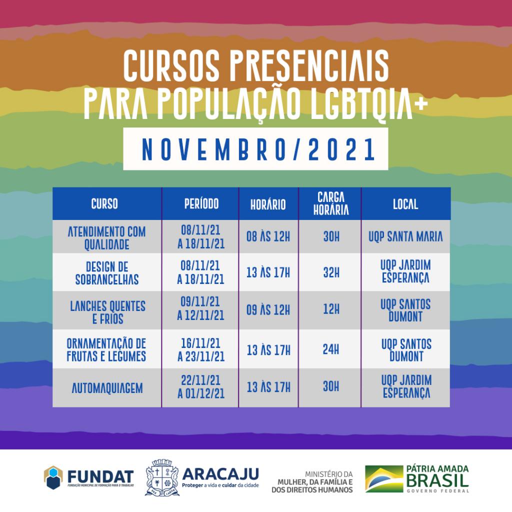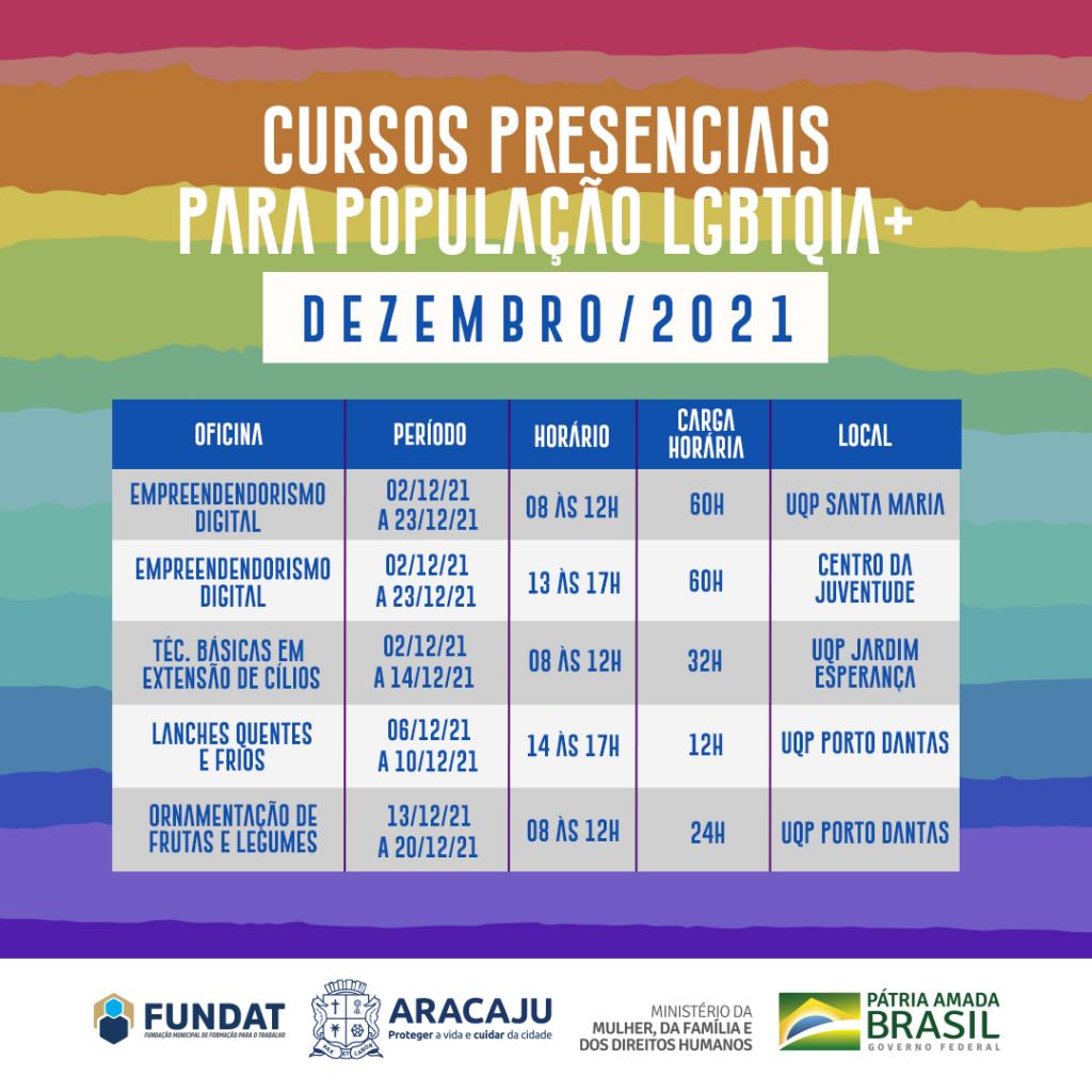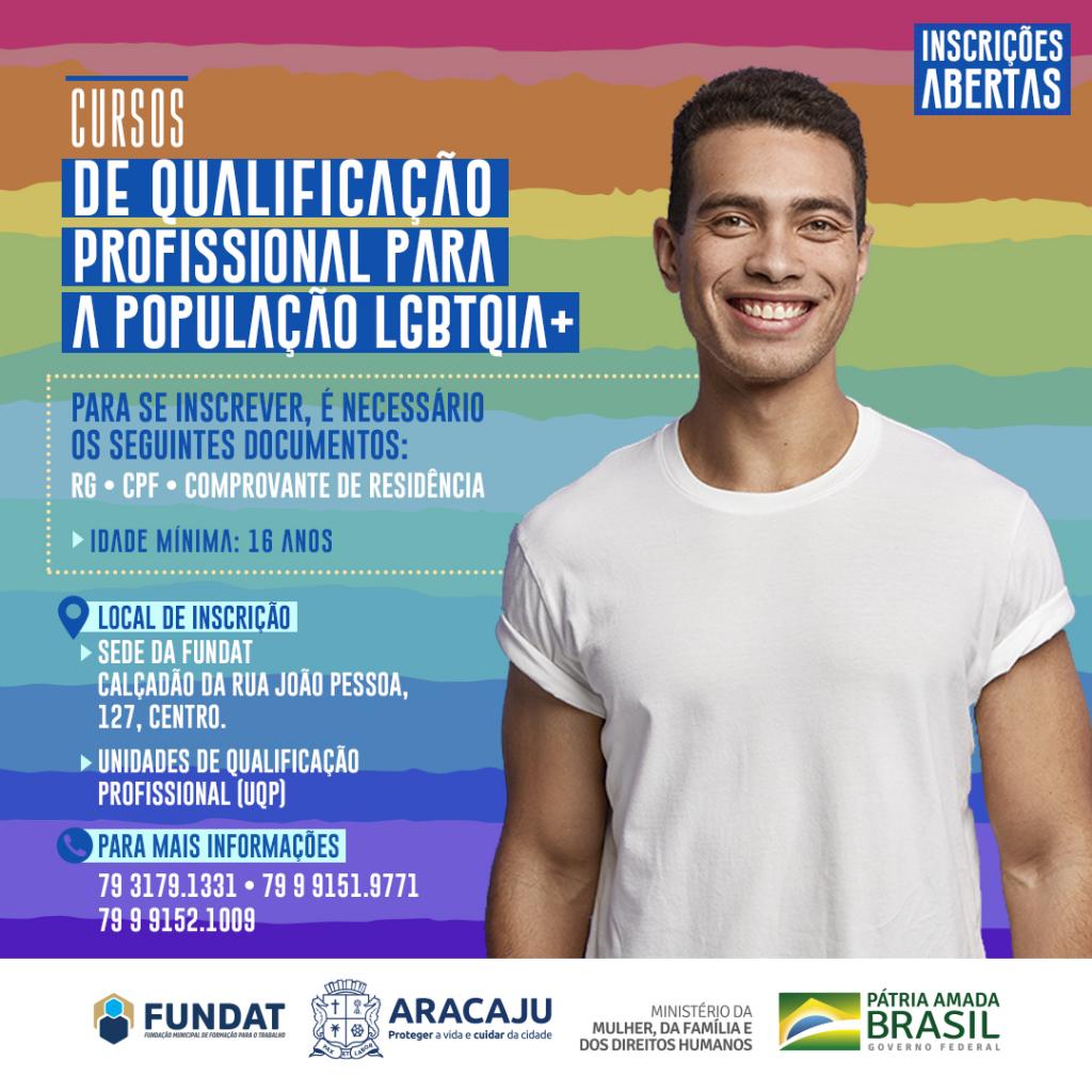 A partir desta quarta-feira, 27, a Prefeitura de Aracaju, por meio da Fundação Municipal de Formação para o Trabalho (Fundat), abre inscrições para novos cursos de qualificação profissional destinados exclusivamente à população LGBTQIA+.