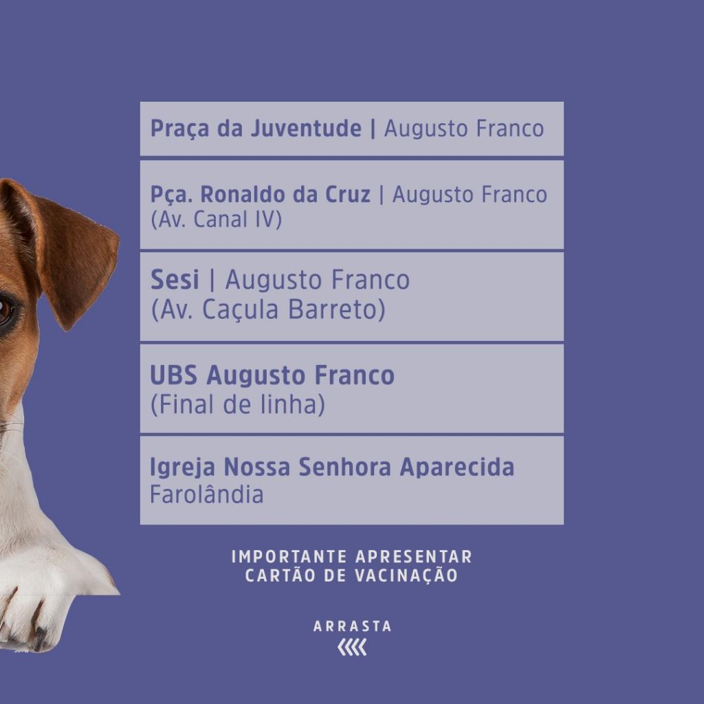 Por meio da Secretaria Municipal da Saúde (SMS), a Prefeitura de Aracaju segue com a vacinação da Campanha Antirrábica e no próximo sábado, dia 30, disponibilizará a vacina em pontos fixos, de 8h às 16h. Neste dia, a ação contemplará os bairros Farolândia, Atalaia, Coroa do Meio, Aeroporto, Aruana, Robalo, Areia Branca, Mosqueiro, 17 de Março, Santa Maria e São Conrado.