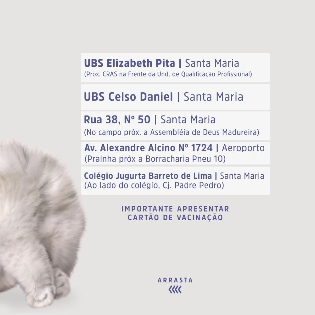 Para ter acesso ao serviço, basta apresentar o cartão de vacina do animal, se tiver. São contemplados na campanha caninos e felinos com idades a partir de três meses de vida. Além da campanha, durante todo o ano o Centro de Controle da Zoonose disponibiliza a vacinação a estes animais. A unidade, que funciona de segunda a sexta-feira, está situada na avenida Dr. Carlos Rodrigues da Cruz, S/N, bairro Capucho, vizinho à sede do Ibama.