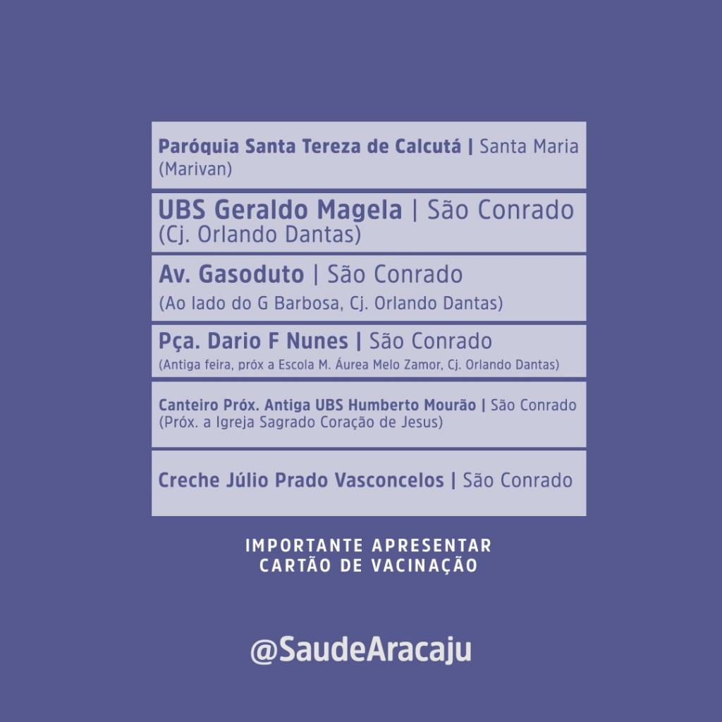 Os pontos seguirão abertos nos dias 6 e 13 de novembro. No dia 6, a ação ocorre nos bairros Inácio Barbosa, Grageru, Luzia, Jabotiana, Siqueira Campos, Ponto Novo, América, Getúlio Vargas, Suissa, Pereira Lobo, Cirurgia, Santo Antônio e Industrial.