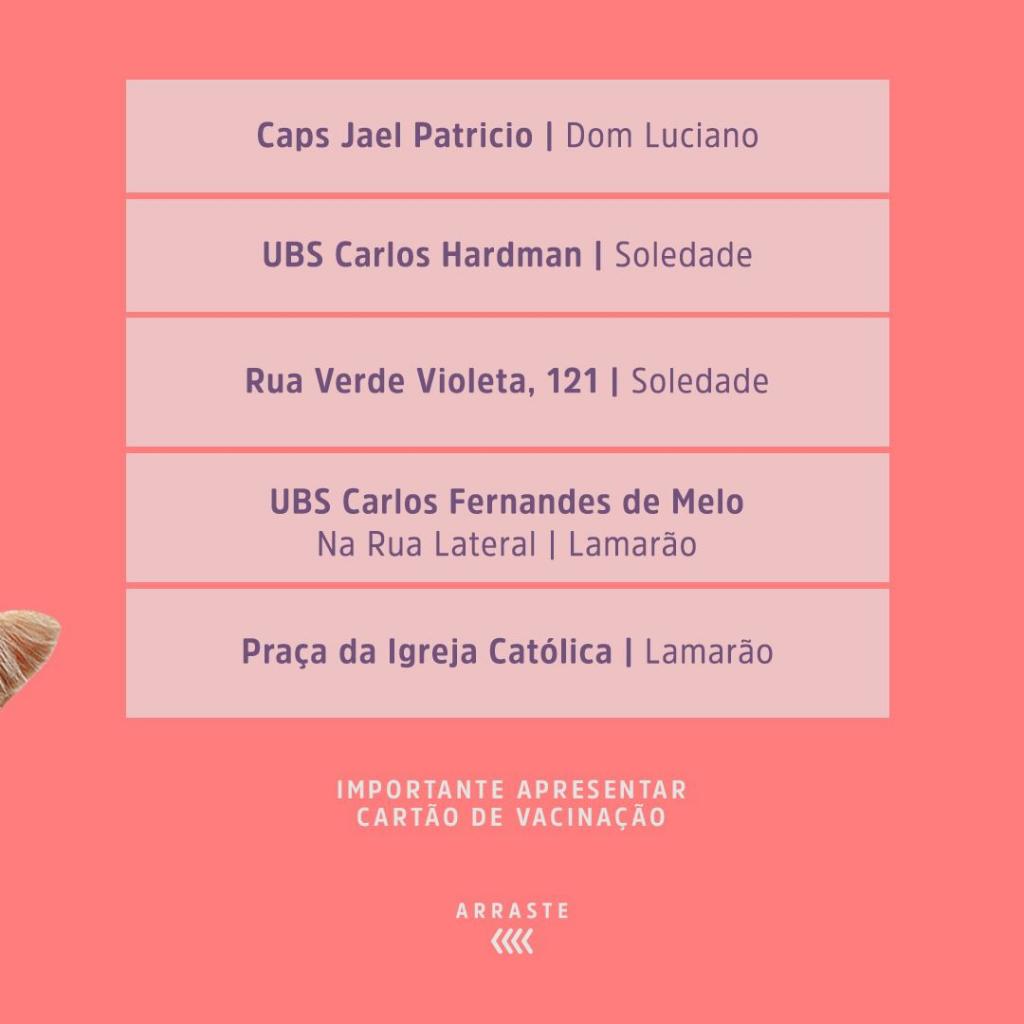 Neste sábado, a ação contemplará os bairros Dom Luciano, Soledade, Lamarão, Japãozinho, Coqueiral, Porto Dantas, Cidade Nova, 18 do Forte, Palestina, José Conrado de Araújo, Santos Dumont, São Carlos, Olaria, Jardim Centenário e Bugio.