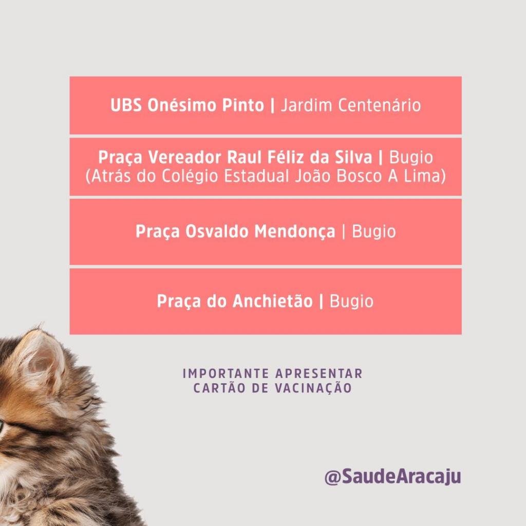Por meio da Secretaria Municipal da Saúde (SMS), a Prefeitura de Aracaju concluirá a Campanha de Vacinação Antirrábica neste sábado, dia 13, quando será disponibilizada a vacina em pontos fixos, de 8h às 16h.