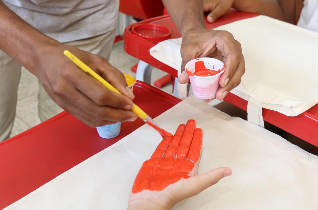 "É bem legal e há uma interatividade geral, porque a oficina consiste em melar as mãos deles de tinta e essa mão, no caso a palma da mão, é colocada sobre a sacola, marcando o tecido de forma que pareça o caule de uma árvore. Em seguida, eles pintam as folhas e até frutos. A gente usa as mãos deles como forma simbólica para que eles possam lembrar dessa realidade, junto com o projeto. Inclusive, eles levam as sacolas para casa, ao final da atividade", explica o professor.