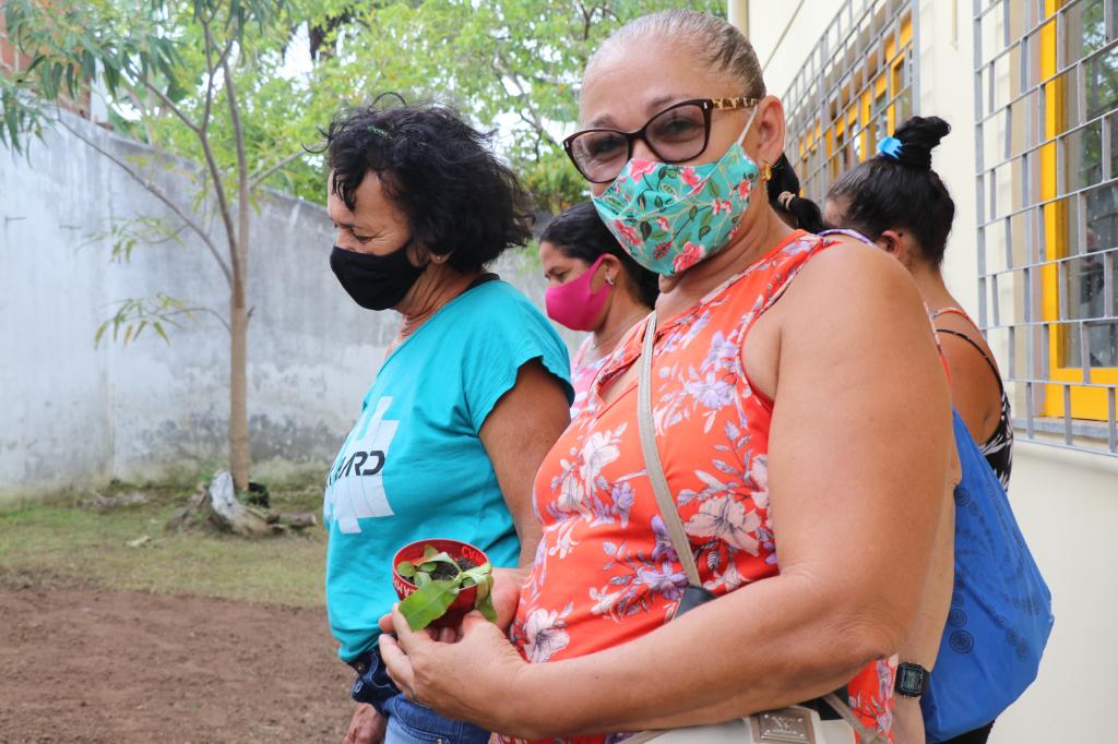 A dona de casa Gerda Maria Santos mora no Porto Dantas e conheceu o projeto a convite de amigas que frequentam o Cras. Ela já foi preparada para plantar a sua primeira muda na horta, levando em sua bolsa sementes de coentrão.