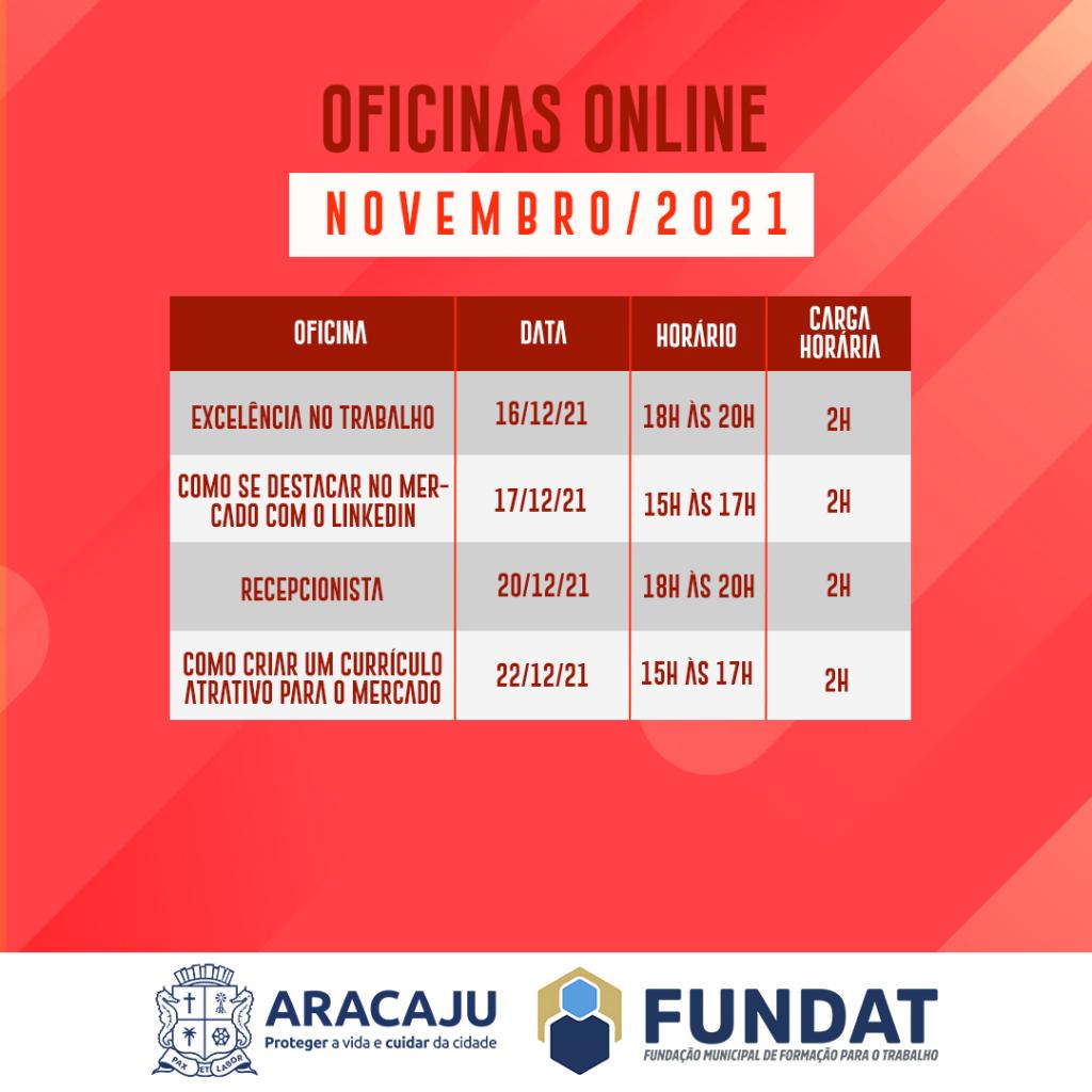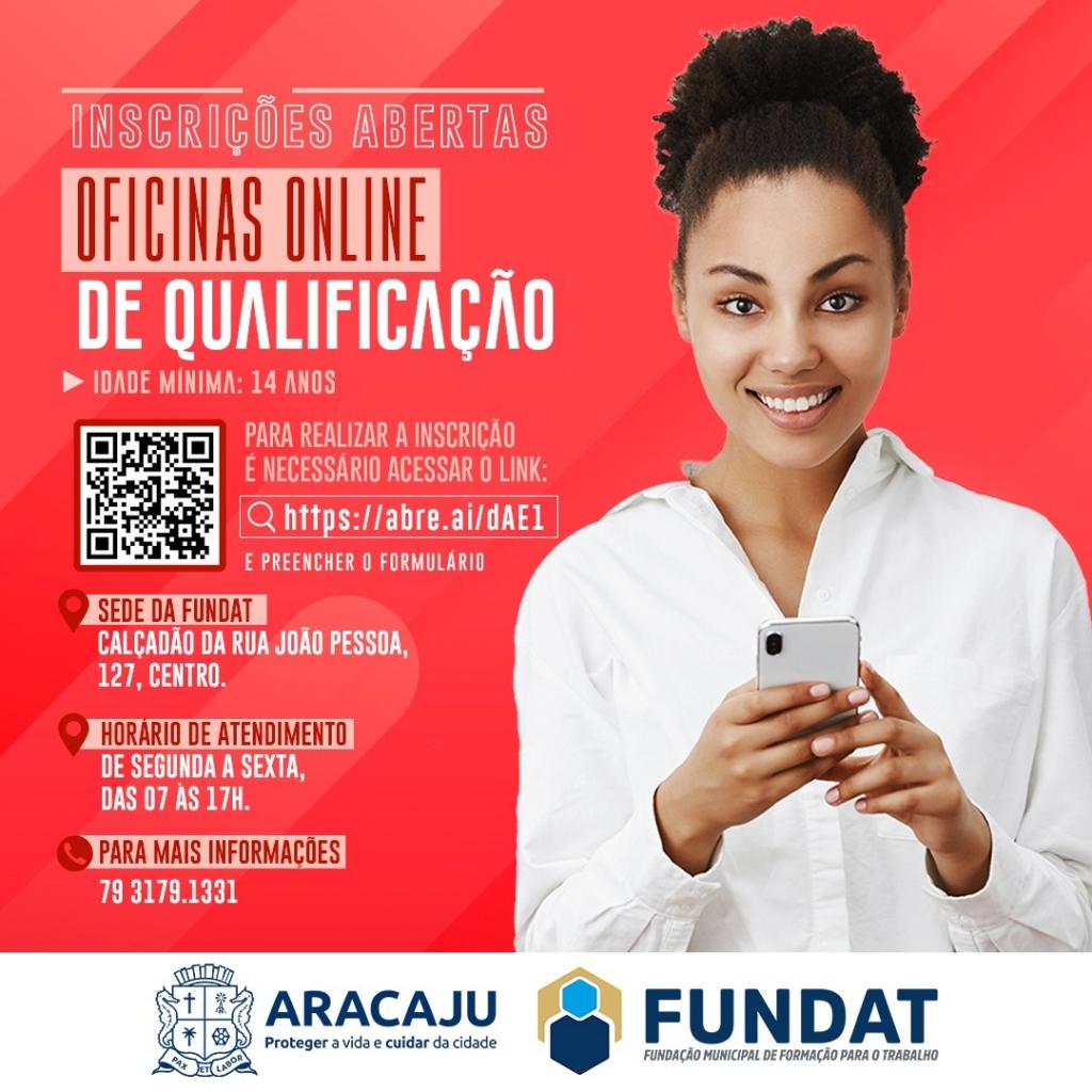 A partir desta quinta-feira, 2, a Prefeitura de Aracaju, por intermédio da Fundação Municipal de Formação para o Trabalho (Fundat), abre inscrições para o preenchimento de 900 vagas, em nove oficinas online, voltadas à qualificação profissional.