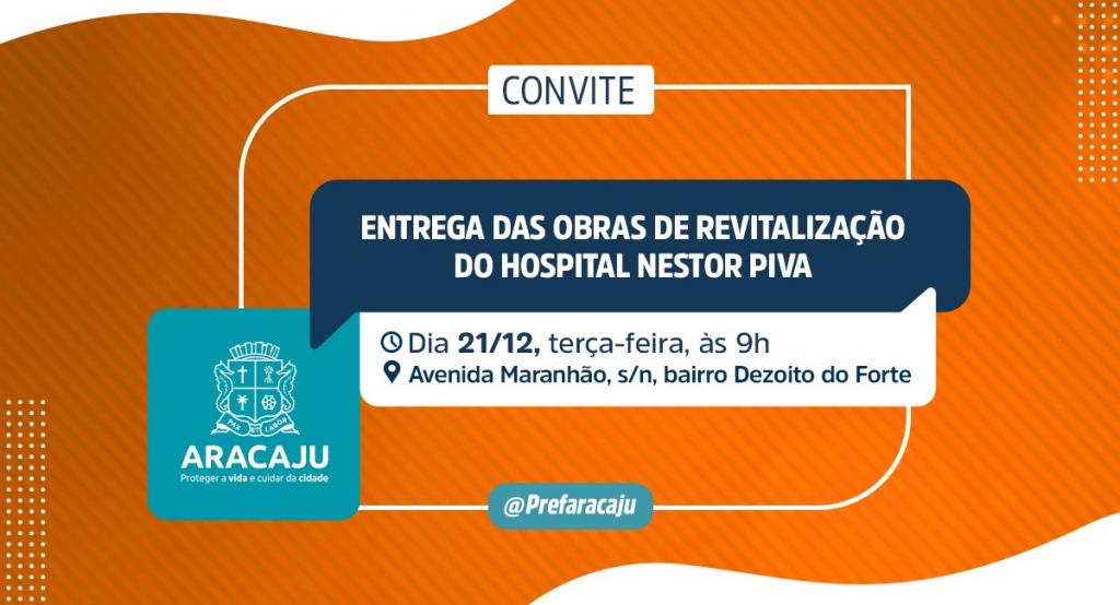 A Prefeitura de Aracaju convida a imprensa para a entrega das obras de revitalização do Hospital Municipal Nestor Piva, nesta terça-feira, 21, às 9h.