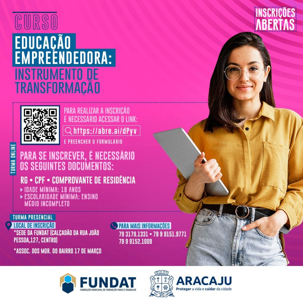 A partir desta terça-feira, 1º, a Prefeitura de Aracaju, por intermédio da Fundação Municipal de Formação para o Trabalho (Fundat), abrirá inscrições para o preenchimento de 100 vagas para o curso de Educação Empreendedora: Instrumento de Transformação.