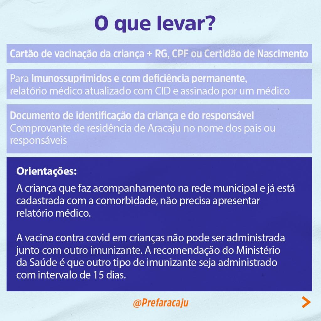 Para que a criança receba a primeira dose, os pais ou responsáveis deverão apresentar documento de identificação com foto e CPF (do menor e do responsável), comprovante de residência de Aracaju e carteira de vacinação da criança.