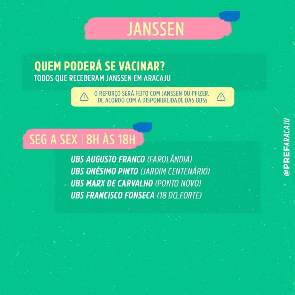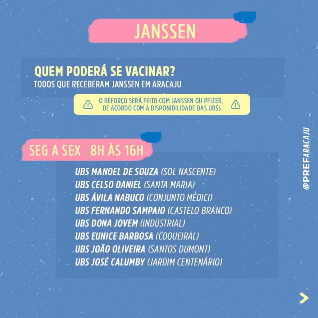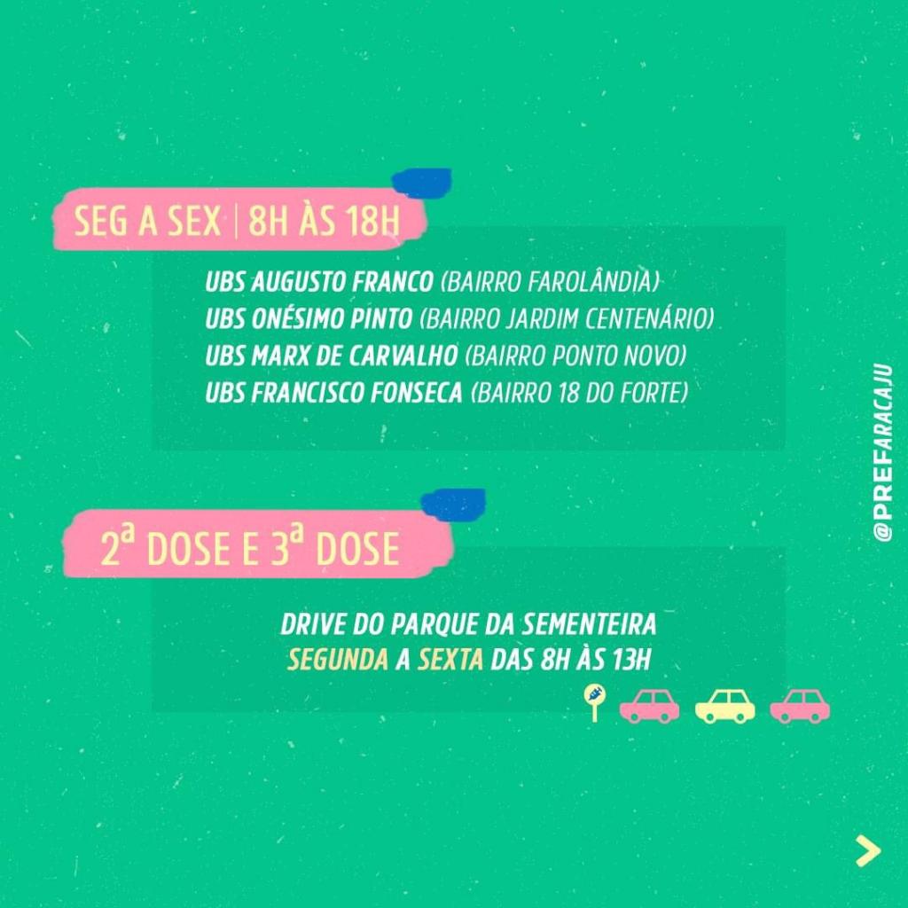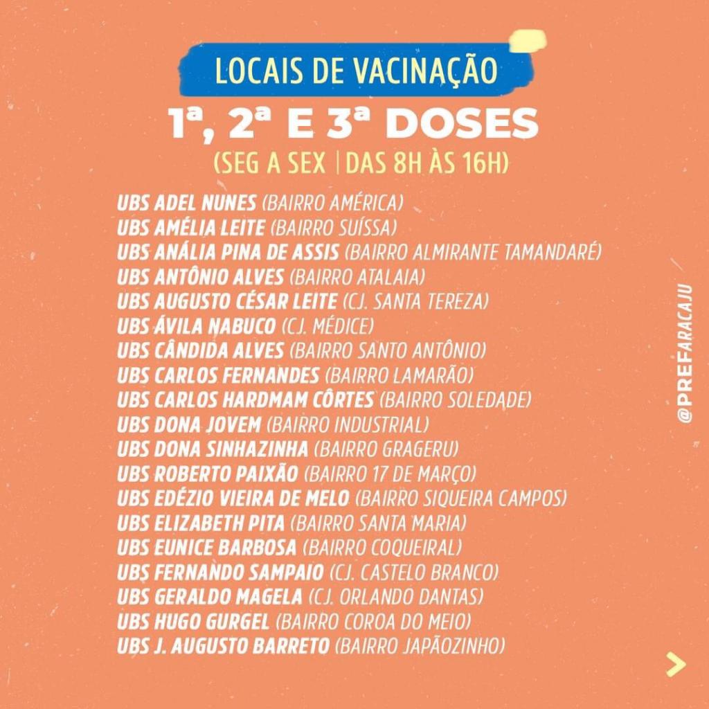 1ª, 2ª e 3ª dose, de segunda a sexta-feira, das 8h às 16h, nas UBSs: Adel Nunes (América); Amélia Leite (Suissa); Anália Pina de Assis (Almirante Tamandaré); Antônio Alves (Atalaia); Augusto César Leite (Aeroporto); Ávila Nabuco (Médici); Cândida Alves (Santo Antônio); Carlos Fernandes (Lamarão); Carlos Hardmam (Soledade); Celso Daniel (Santa Maria); Dona Jovem (Industrial); Dona Sinhazinha (Grageru); Roberto Paixão (17 de Março); Edézio Vieira de Melo (Siqueira Campos); Elisabete Pita (Santa Maria); Eunice Barbosa (Coqueiral); Fernando Sampaio (Castelo Branco); Geraldo Magela (Orlando Dantas); Hugo Gurgel (Coroa do Meio); José Augusto Barreto (Japãozinho); Joaldo Barbosa (América); João Bezerra (Povoado Areia Branca); João Cardoso (José Conrado de Araújo); João Oliveira Sobral (Santos Dumont);José Calumby (Jardim Centenário); José Machado de Souza (Santos Dumont); José Quintiliano (Cidade Nova); Lauro Dantas (Bugio); Madre Tereza (Jaboatiana); Manoel de Souza Pereira (Sol Nascente); Maria do Céu (Centro); Ministro Costa Cavalcante (Inácio Barbosa); Niceu Dantas (Mosqueiro); Osvaldo Leite (Sta Maria); Osvaldo de Souza (Getúlio Vargas); Porto Dantas (Porto Dantas); Renato Mazze Lucas (Santos Dumont); Santa Terezinha (Robalo); e Walter Cardoso (Veneza);
