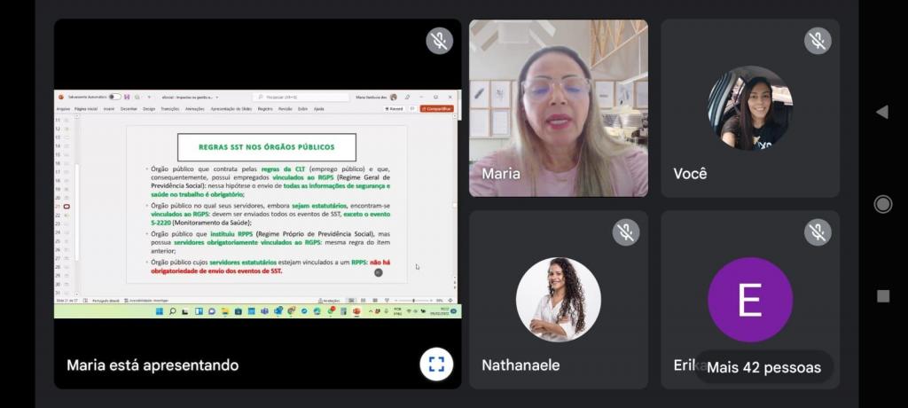 A Escola de Governo e Administração Pública de Aracaju (Esgap), órgão vinculado à Secretaria Municipal do Planejamento, Orçamento e Gestão (Seplog), promoveu nesta quarta-feira, 9, uma palestra sobre o eSocial para servidores da Prefeitura de Aracaju. O encontro, realizado de forma híbrida, contou com a participação presencial e online de mais de 60 servidores.