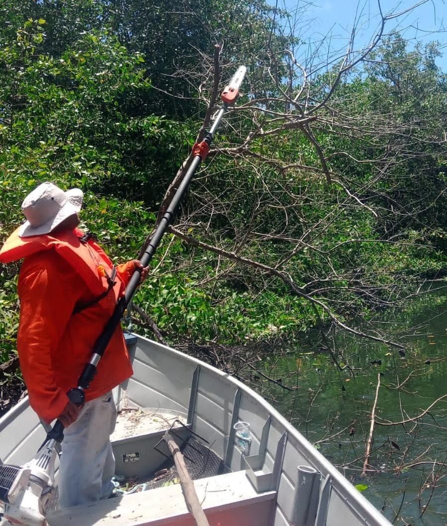 Esta semana, a equipe da Emsurb navegou pelo Poxim, nas imediações do bairro Jabotiana, zona Oeste da capital, e removeu troncos e galhos de árvores caídos em trechos do seu curso, como explica o diretor de Operações do órgão, Bruno Moraes.
