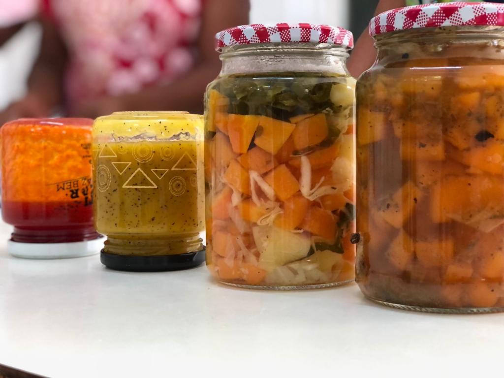 Na oficina, ministrada pela equipe da Gerência de Segurança Alimentar e Nutricional (GSAN), foram trabalhadas técnicas de conservas de alimentos e produção de geleias utilizando produtos plantados e cultivados nas hortas comunitárias.