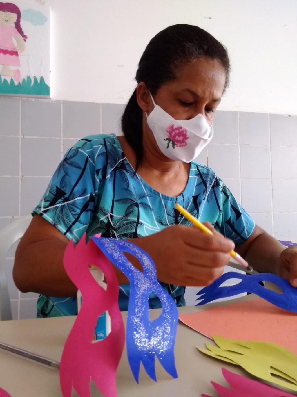 Em clima de Carnaval, as equipes de trabalho das unidades socioassistenciais se empenharam na preparação de adereços carnavalescos entregues aos usuários, como a oficineira do Cras Carlos Hardman, Miralda Santos. No bairro Soledade, ela confeccionou painéis, máscaras, serpentinas, dentre outros itens.