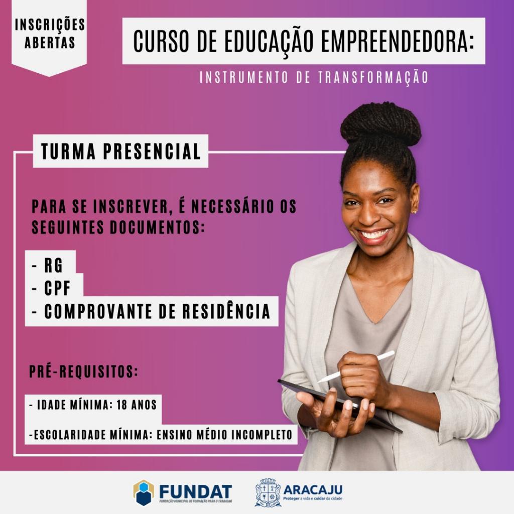 A Prefeitura de Aracaju, por meio da Fundação Municipal de Formação para o Trabalho (Fundat), abre inscrições, nesta quarta-feira, 16, para duas novas turmas presenciais do curso Educação Empreendedora: instrumento de transformação.