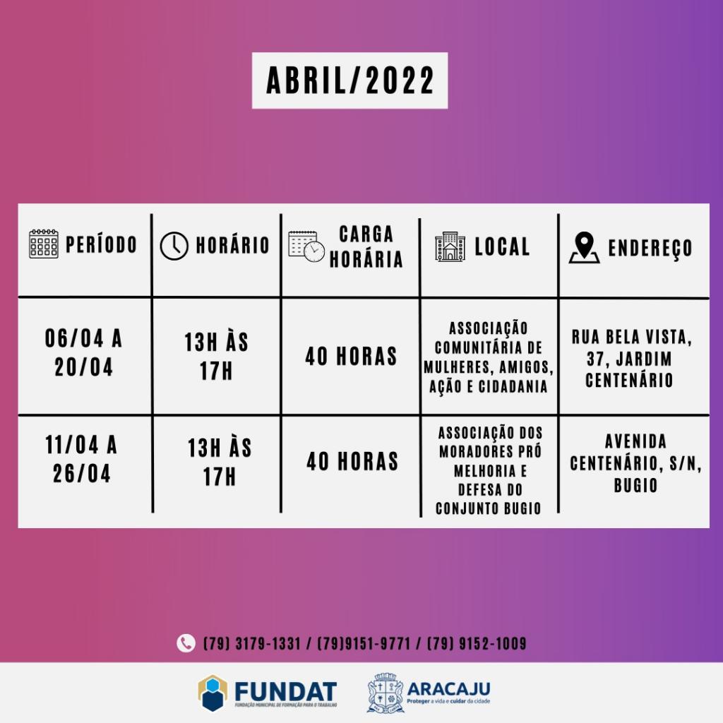O curso possui carga horária de 40 horas e será ministrado na modalidade presencial. As aulas da primeira turma serão iniciadas no dia 6 de abril, na Associação Comunitária de Mulheres, Amigos, Ação e Cidadania; e da segunda turma no dia 11de abril, na Associação dos Moradores Pró Melhoria e Defesa do Conjunto Bugio. Ao final da capacitação, os alunos irão receber o certificado de conclusão.
