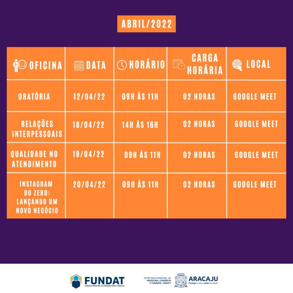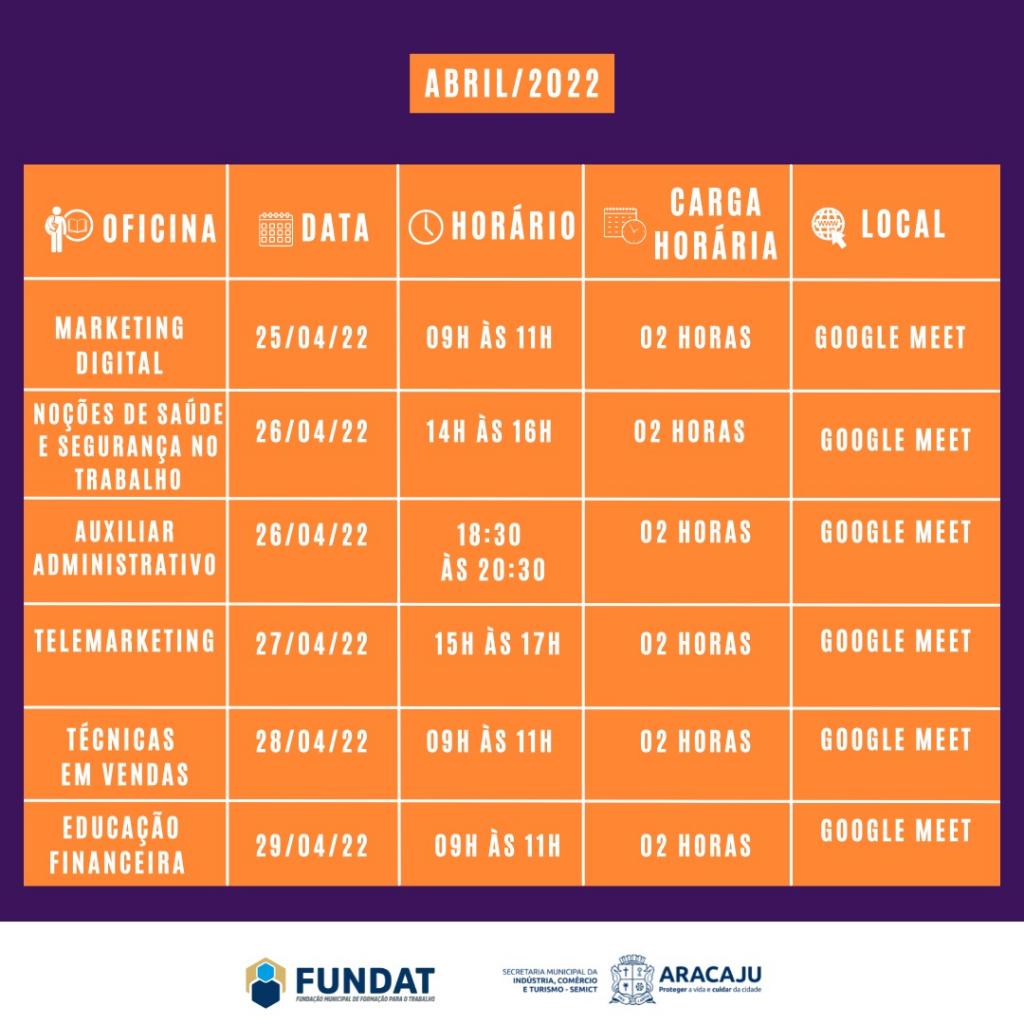 A Prefeitura de Aracaju abre nesta quarta-feira, 23, as inscrições para dez oficinas online da Fundação Municipal de Formação para o Trabalho (Fundat). As capacitações serão realizadas durante todo o mês de abril e contemplam diversas áreas do conhecimento,visando a qualificação profissional para o mercado de trabalho.